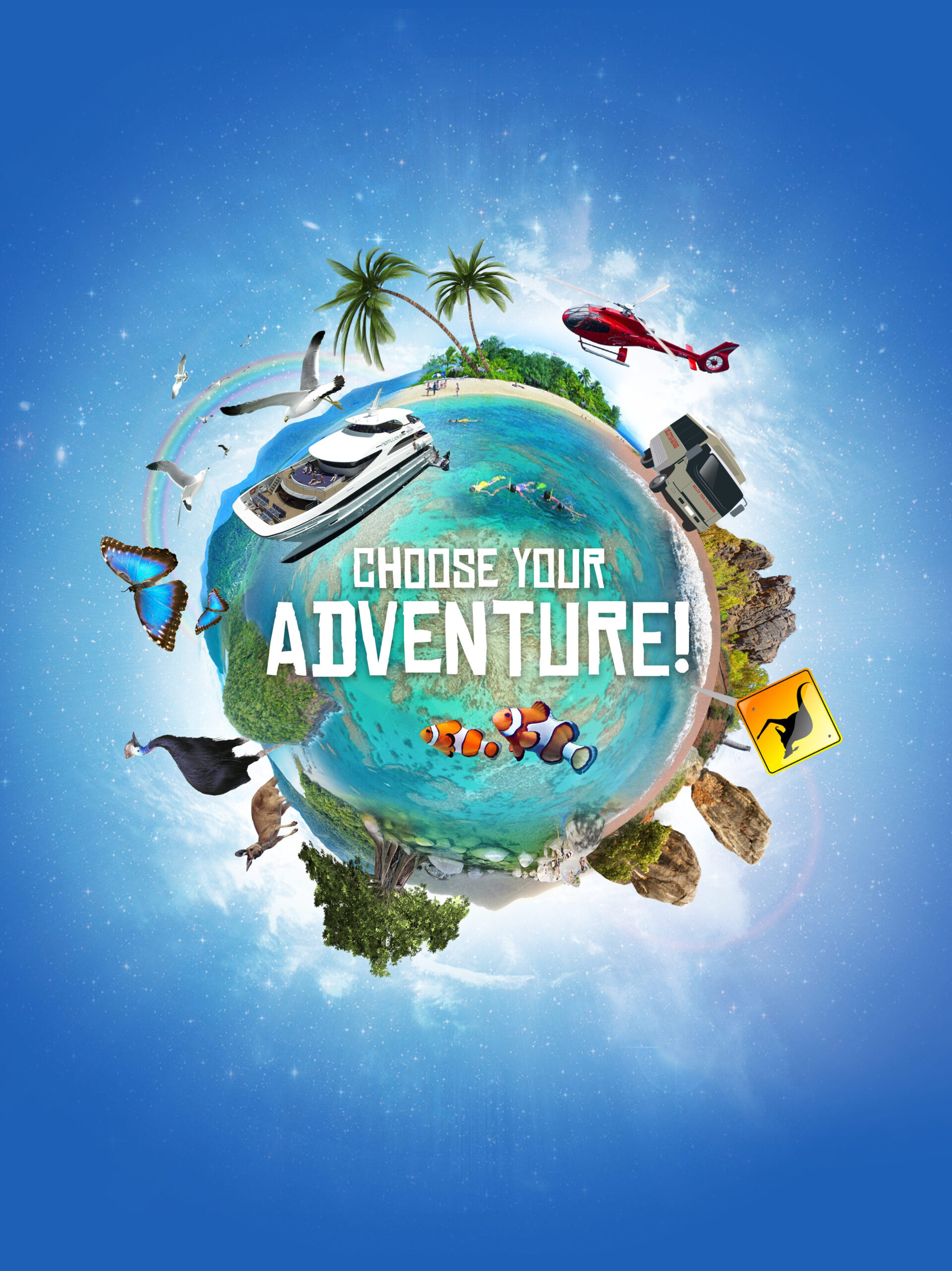 We developed the central “Choose Your Adventure” graphic to solve the challenge of incorporating a wide variety of tours into one cohesive design, while making it eye-catching and distinctly different from the conservative branding common in the Cairns tourism market.